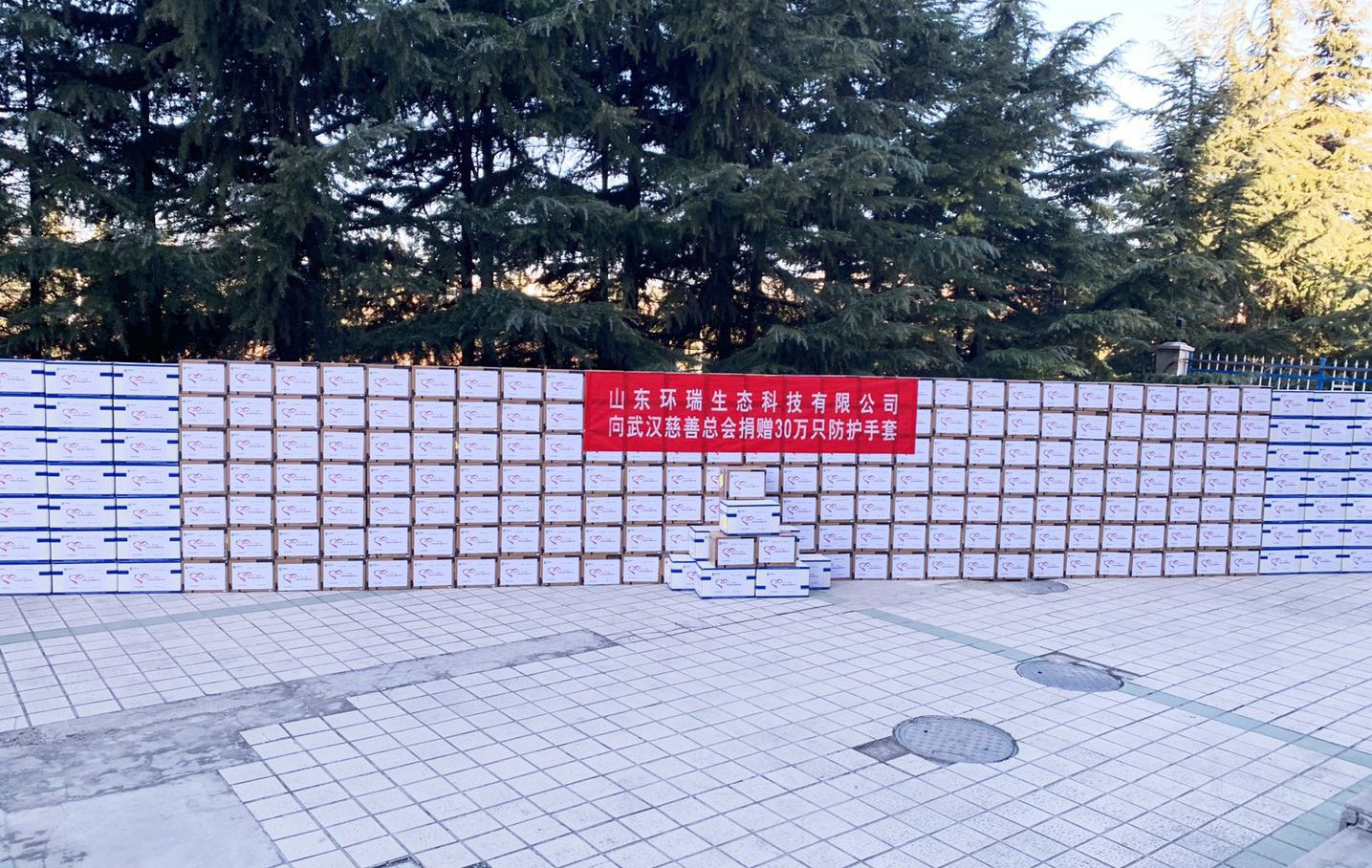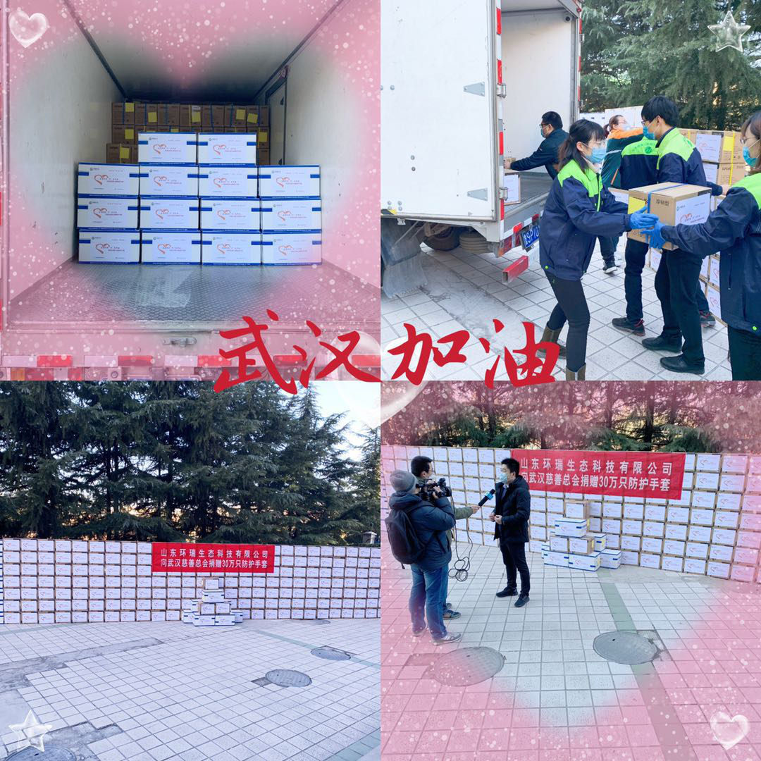 山東環瑞生態于2月17日向武漢慈善總會捐贈了30萬只防護手套,一箱一箱的手套不僅代表了公司的心意,還承載了我們同舟共濟、守望相助的決心。
