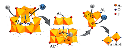 產品進入廢水后,經復配物催化,會產生大量具有“核環(Keggin)”結構的AlO4Al12(OH)24(H2O)127+ (?-K Al137+ ),通過羥基質子化和水合作用導致其原位解離,氟在多個羥基位點快速取代Al137+的η-OH2,形成穩定的配合物;同時因正電荷密度降低,加速配合物(Al13Fn)聚集沉淀,實現游離態氟向顆粒態氟的轉化,再經高分子絮凝劑搭橋、捕捉等作用,快速實現泥水分離,達到廢水除氟目的。