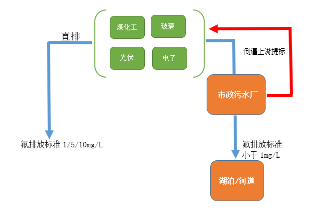 國家《污水綜合排放標準》排放標準中氟離子濃度小于10mg/L。地面水氟最高容許濃度為1mg/L。很多地方標準也規定氟離子濃度小于1mg/L。含氟廢水處理,成為了目前很多工廠的難題,很多工廠目前直排的標準都是要求氟離子濃度小于1mg/L,即使下游的污水處理廠能夠通過合并多股廢水的方式稀釋總排水的氟濃度,但各地區環保局紛紛對相對應的污水處理廠提高含氟廢水的標準至小于1mg/L,進而導致污水處理廠反過來限制上游的各類產生含氟廢水工廠只能排放比以往更低的含氟廢水。