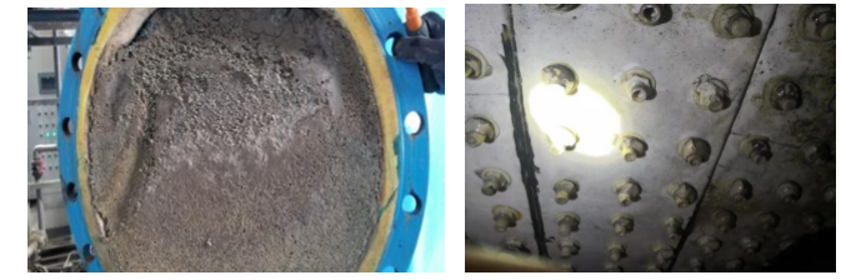 其次,使用鈣鹽運行時,在水流緩慢(吸附塔、過濾器等)和濾徑較小的工段,容易發生析鹽現象,這會引起管道堵塞及結垢(我司以往客戶使用均出現類似情況,具體如下圖所示),需后續定期清理,影響運行的穩定性。