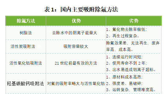 現在市面上較常見的除氟方法是吸附法,如用活性氧化鋁吸附,此方法經濟實惠,但弊端也較多,再生流程復雜,并且再生后吸附能力大大下降。其他除氟方法介紹(如表1):