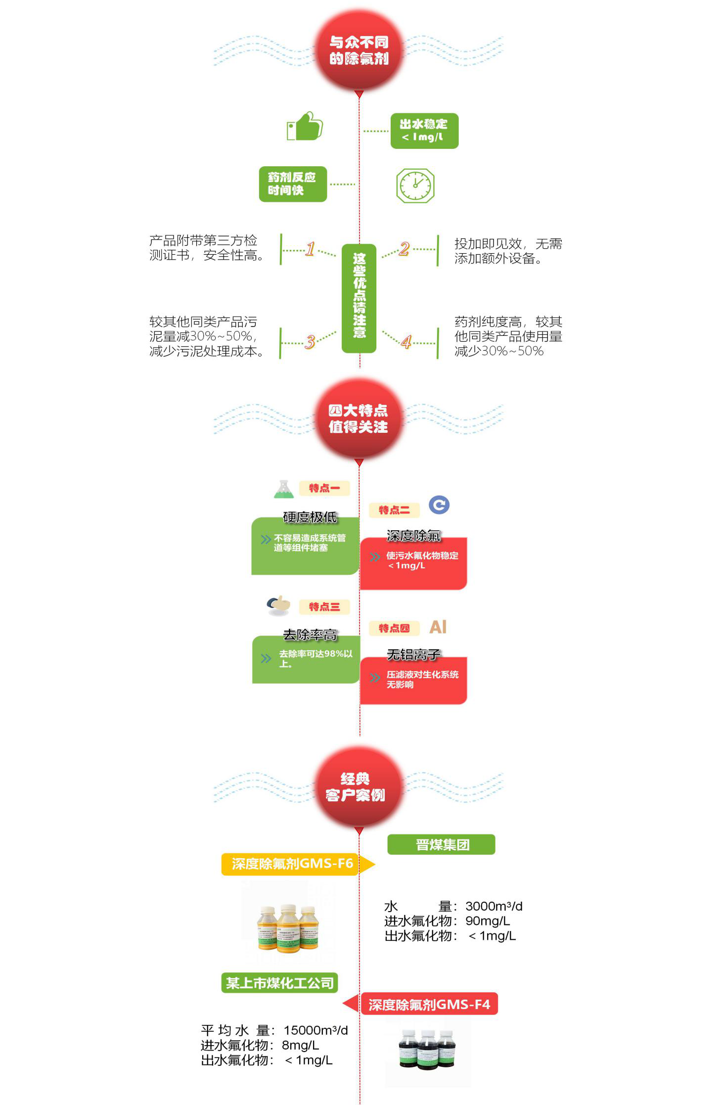 針對國內現有工業含氟廢水深度處理工藝技術受局限的局面,山東環瑞生態立足于行業前沿,創新理念,推出了深度除氟劑和高效除氟劑系列,是專門針對污水氟超標的專用藥劑。