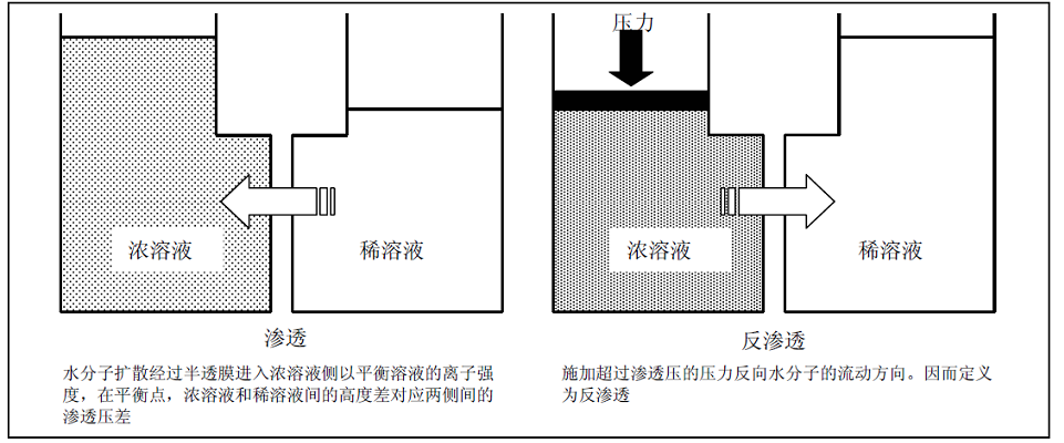 反滲透法就是借助于比滲透壓更高的壓力,改變自然滲透方向,把原水水質中的氟離子壓向半透膜稀溶液一邊的處理過程。