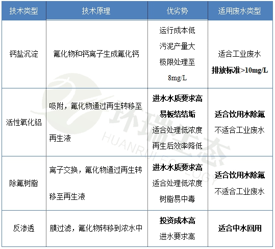 除了鈣鹽沉淀法之外,目前比較常見的去除技術(shù)還有氧化鋁吸附,樹脂離子交換和反滲透等。每一項技術(shù)都有其相應(yīng)的優(yōu)劣勢和適用的廢水類型,具體統(tǒng)計如下表所示: