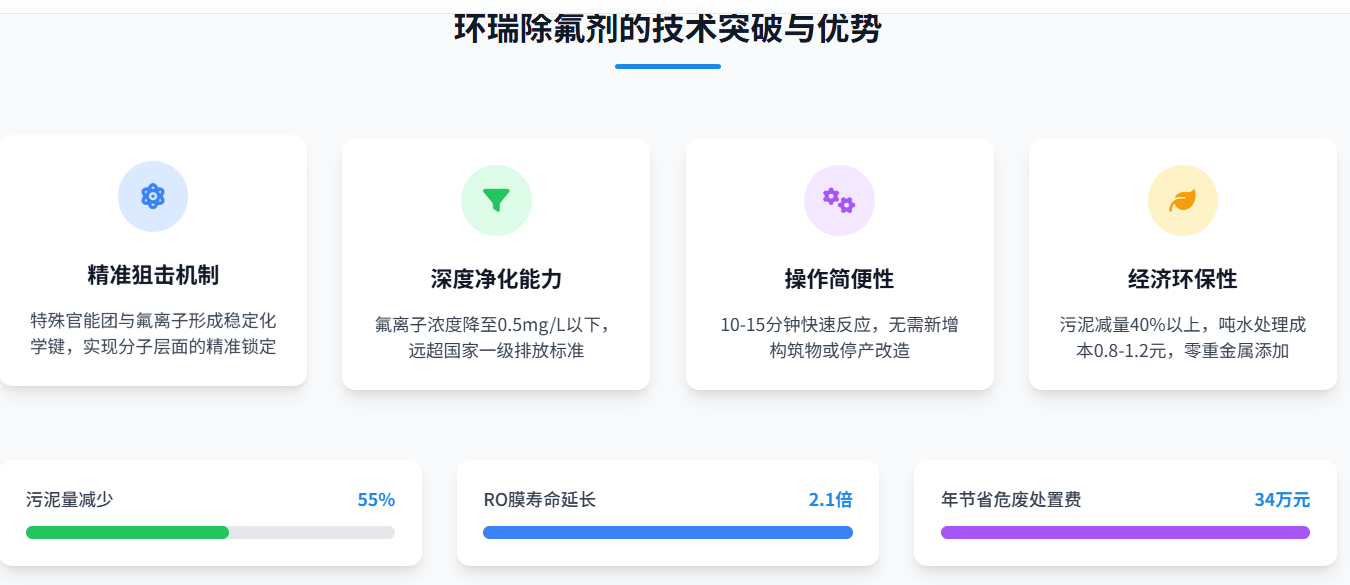 環瑞除氟劑的藥劑純度>99%,投加量少,污泥減量40%以上,噸水處理成本降低至0.8-1.2元,顯著降低了企業的運維成本。同時,其零重金屬添加、智能降解設計、PH自適應等特性,使其在環保安全方面具有顯著優勢。