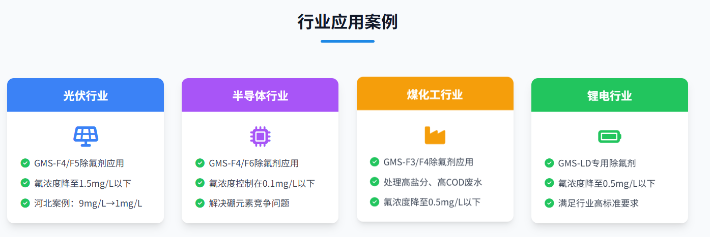 強吸附與離子交換的精準狙擊機制環瑞通過多年的技術積累,開發出了一系列高效除氟劑,如GMS-F3、GMS-F4、GMS-F6、GMS-F7等,針對不同濃度和類型的含氟廢水提供定制化解決方案。其核心優勢在于: