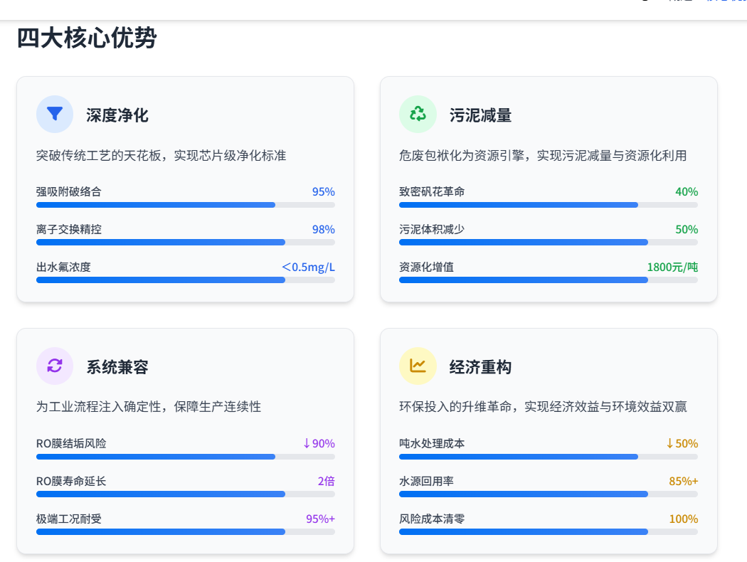 工業含氟廢水的治理一直是環保與生產之間的難題,傳統工藝在深度凈化、污泥處理和系統兼容性方面存在諸多限制。然而,環瑞除氟劑憑借其“強吸附+離子交換”雙核機理,成功突破了這一技術瓶頸,為工業廢水治理帶來了全新的解決方案。以下從四個核心優勢出發,詳細分析環瑞除氟劑在工業除氟領域的優勢特點。